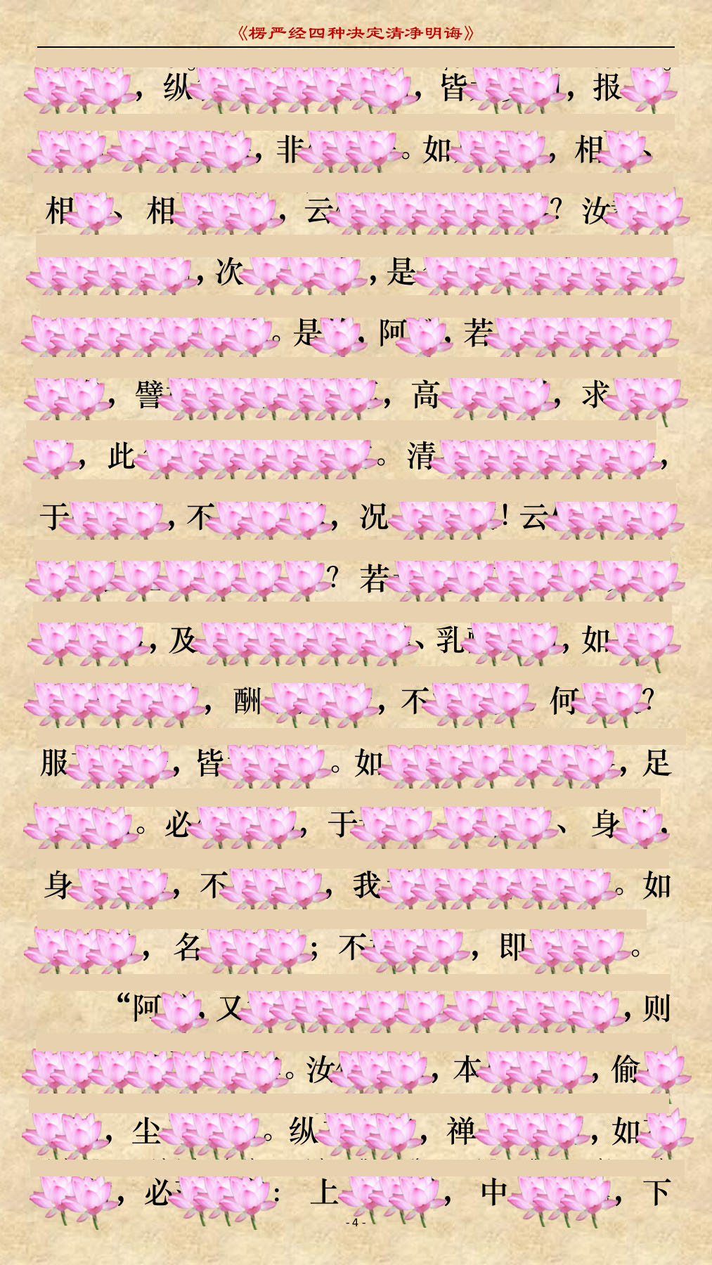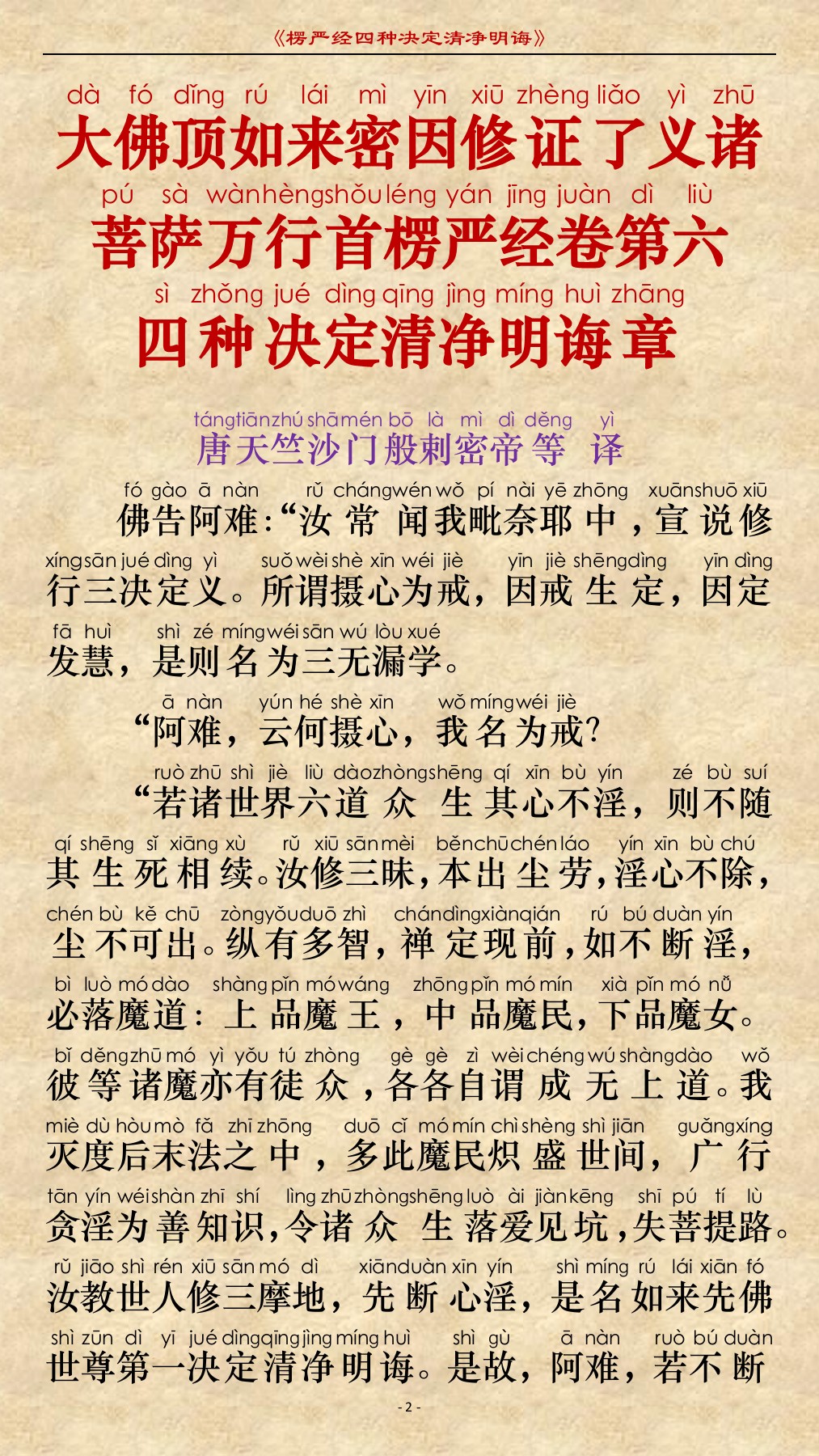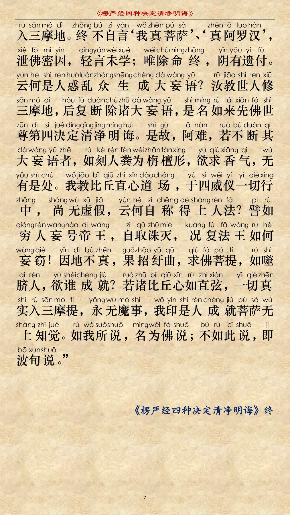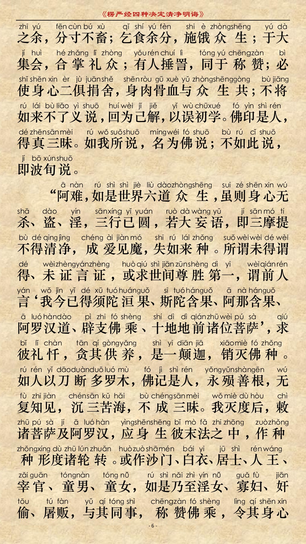 阿难。如是世界六道众生,虽则身心无杀盗淫,三行已圆,若大妄语,即三摩地不得清净,成爱见魔,失如来种。所谓未得谓得,未证言证。或求世间尊胜第一。谓前人言,我今已得须陀洹果,斯陀含果,阿那含果,阿罗汉道,辟支佛乘,十地地前诸位菩萨。求彼礼忏,贪其供养。是一颠迦,销灭佛种。如人以刀断多罗木。佛记是人永殒善根,无复知见。沈三苦海,不成三昧。我灭度后,敕诸菩萨及阿罗汉,应身生彼末法之中,作种种形,度诸轮转。或作沙门白衣居士,人王宰官,童男童女,如是乃至淫女寡妇,奸偷屠贩,与其同事,称赞佛乘,令其身心,入三摩地。终不自言,我真菩萨,真阿罗汉,泄佛密因,轻言末学。唯除命终,阴有遗付。云何是人,惑乱众生,成大妄语。汝教世人,修三摩地,后复断除诸大妄语。是名如来,先佛世尊,第四决定,清净明诲。是故阿难。若不断其大妄语者,如刻人粪为栴檀形,欲求香气,无有是处。我教比丘,直心道场,于四威仪,一切行中,尚无虚假。云何自称,得上人法。譬如穷人,妄号帝王,自取诛灭。况复法王,如何妄窃。因地不真,果招纡曲。求佛菩提,如噬脐人,欲谁成就。若诸比丘,心如直弦,一切真实,入三摩地,永无魔事。我印是人,成就菩萨,无上知觉。如我所说,名为佛说。不如此说,即波旬说。