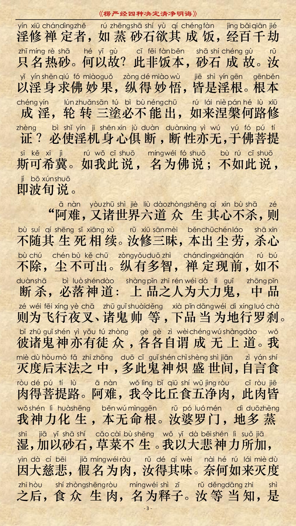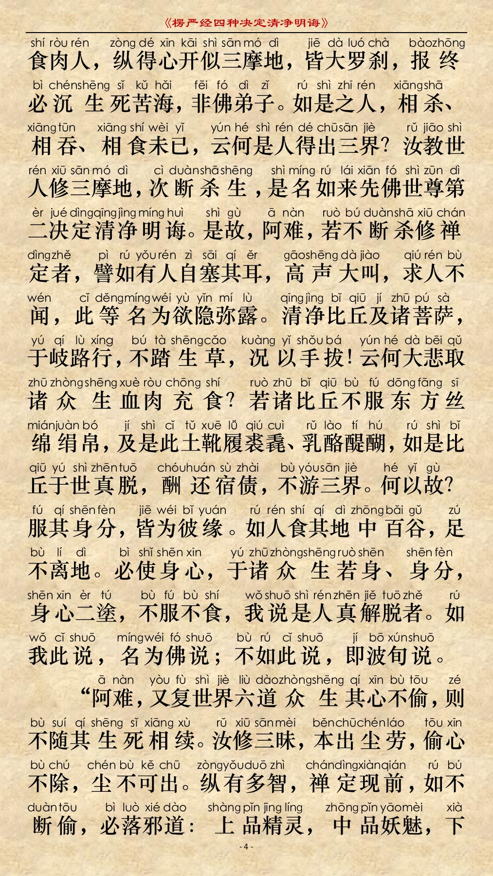 阿难。又诸世界六道众生,其心不杀,则不随其生死相续。汝修三昧,本出尘劳。杀心不除,尘不可出。纵有多智,禅定现前。如不断杀,必落神道。上品之人,为大力鬼。中品则为飞行夜叉诸鬼帅等。下品当为地行罗刹。彼诸鬼神亦有徒众。各各自谓成无上道。我灭度后末法之中,多此鬼神,炽盛世间,自言食肉得菩提路。阿难。我令比丘食五净肉。此肉皆我神力化生,本无命根。汝婆罗门,地多蒸湿,加以砂石,草菜不生。我以大悲神力所加,因大慈悲假名为肉,汝得其味。奈何如来灭度之后,食众生肉,名为释子。汝等当知。是食肉人,纵得心开似三摩地,皆大罗刹,报终必沈生死苦海,非佛弟子。如是之人,相杀相吞,相食未已,云何是人得出三界。汝教世人修三摩地,次断杀生。是名如来先佛世尊,第二决定清净明诲。是故阿难。若不断杀修禅定者,譬如有人自塞其耳,高声大叫,求人不闻,此等名为欲隐弥露。清净比丘及诸菩萨,于歧路行,不蹋生草,况以手拔。云何大悲,取诸众生血肉充食。若诸比丘,不服东方丝绵绢帛,及是此土靴履裘毳,乳酪醍醐。如是比丘,于世真脱,酬还宿债,不游三界。何以故?服其身分,皆为彼缘。如人食其地中百谷,足不离地。必使身心,于诸众生若身身分,身心二涂,不服不食,我说是人真解脱者。如我此说,名为佛说。不如此说,即波旬说。