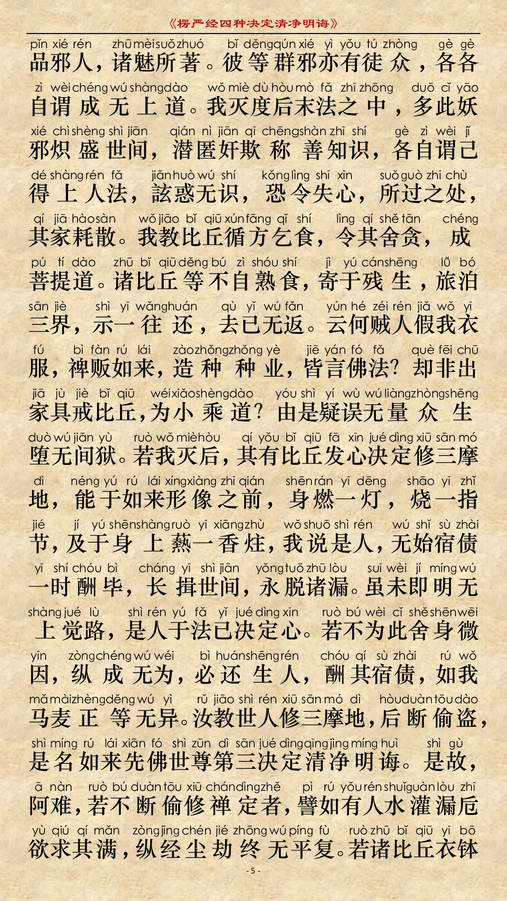 阿难。又复世界,六道众生,其心不偷,则不随其生死相续。汝修三昧,本出尘劳。偷心不除,尘不可出。纵有多智,禅定现前。如不断偷,必落邪道。上品精灵、中品妖魅、下品邪人,诸魅所著。彼等群邪,亦有徒众。各各自谓,成无上道。我灭度后,末法之中,多此妖邪,炽盛世间,潜匿奸欺,称善知识。各自谓已,得上人法。诱惑无识,恐令失心。所过之处,其家耗散。我教比丘,循方乞食,令其舍贪,成菩提道。诸比丘等,不自熟食,寄于残生,旅泊三界,示一往还,去已无返。云何贼人,假我衣服,裨贩如来。造种种业,皆言佛法,却非出家,具戒比丘,为小乘道。由是疑误,无量众生,堕无间狱。若我灭后,其有比丘,发心决定,修三摩地,能于如来,形像之前,身然一灯,烧一指节,及于身上,爇一香炷。我说是人,无始宿债,一时酬毕,长揖世间,永脱诸漏。虽未即明,无上觉路。是人于法,已决定心。若不为此,舍身微因,纵成无为,必还生人,酬其宿债。如我马麦,正等无异。汝教世人,修三摩地。后断偷盗,是名如来。先佛世尊,第三决定,清净明诲。是故阿难。若不断偷,修禅定者,譬如有人,水灌漏卮。欲求其满,纵经尘劫,终无平复。若诸比丘,衣钵之余,分寸不畜。乞食余分,施饿众生。于大,合掌礼众。有人捶詈,同于称赞。必使身心,二俱捐舍。身肉骨血,与众生共。不将如来不了义说,回为己解,以误初学。佛印是人得真三昧。如我所说。名为佛说。不如此说,即波旬说。