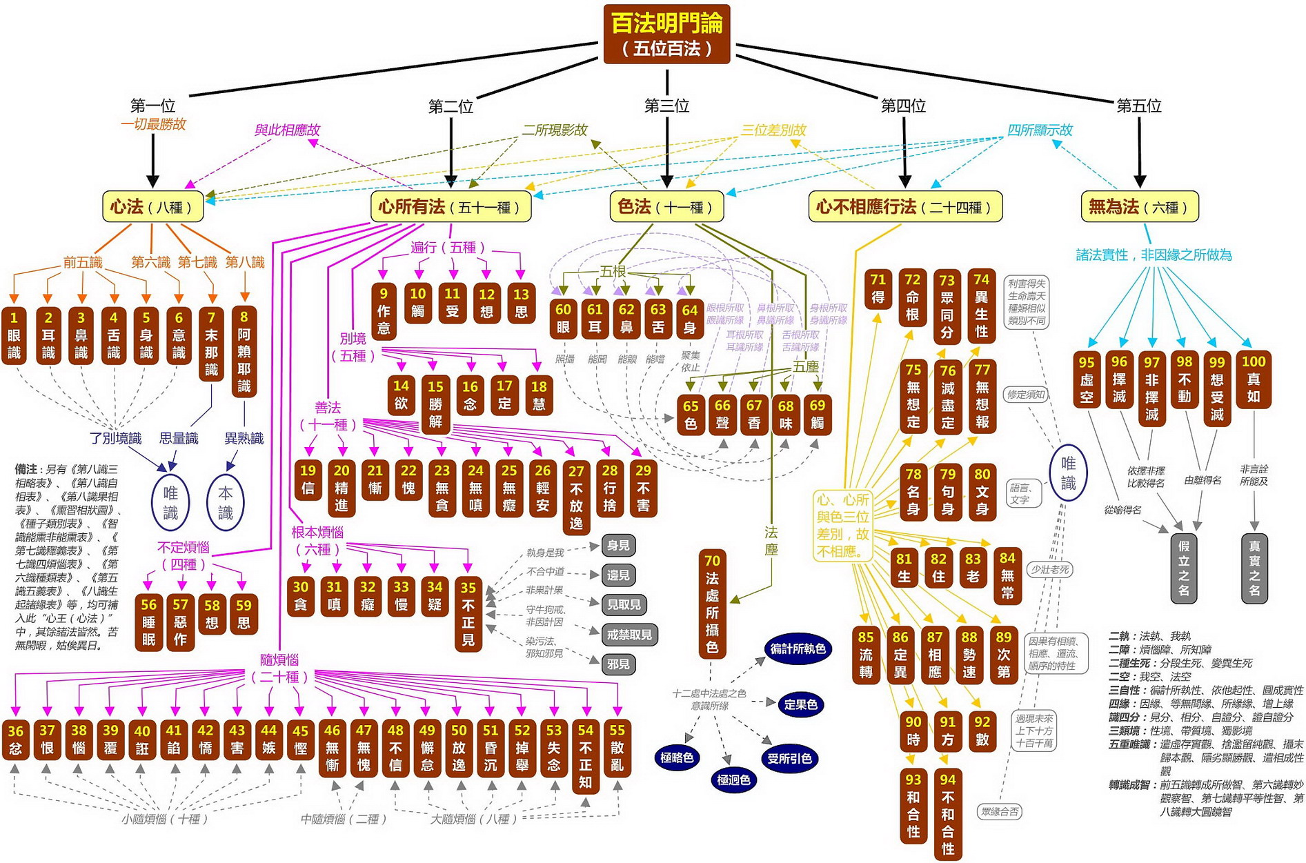 百法论,又分百法为五位,谓一切法略有五种。一者心法,略有八种。二者心所有法,略有五十一种。三者色法,略有十一种。四者心不相应行法,略有二十四种。五者无为法,略有六种。是为五位百法。俱舍论亦分七十五法为五位。一者色法,此有十一。二者心法,唯一。三者心所有法,有四十六。四者心不相应行法,此有十四。五者无为法,此有三种是为五位七十五法。